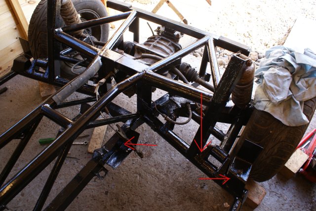 Also check the trailing arm bracket marked with the middle arrow in this picture: