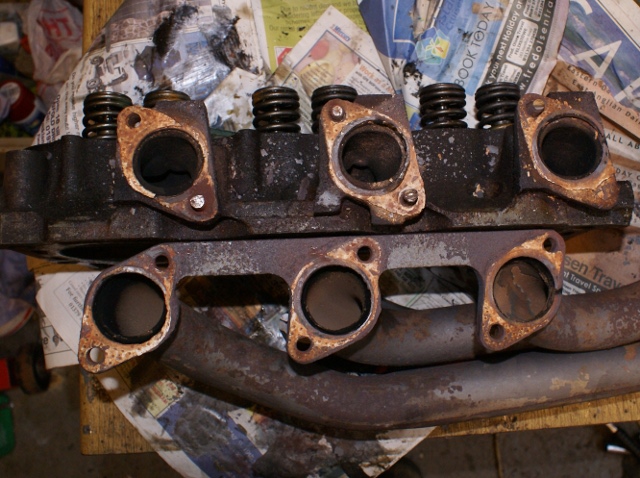 The exhaust manifold has been blowing so the gaskets need replacing. Looking at the bolts it looked unlikely that they would shift and sure enough the first one sheared. Of the 12 bolts only 4 came undone. The rest either sheared or had the heads cut off. Tomorrow I'll attempt to extract the bolt remains with the aid of the MIG welder. Failing that, then it is a case of using the heads from my spare engine.