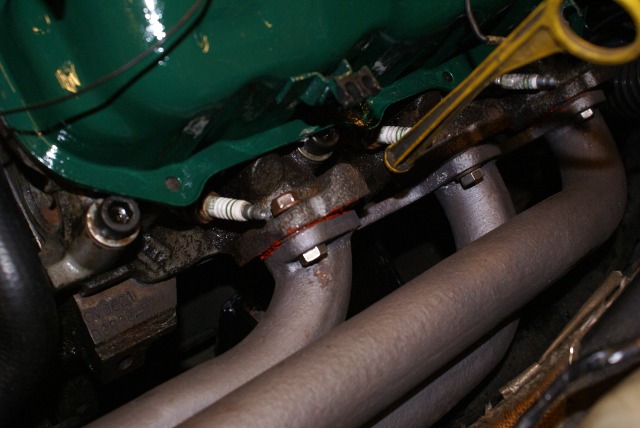 Over the last few evenings the rocker covers have been cleaned up and treated to a couple of coats of smooth green hamerite. The steel exhaust manifold has had some welding on it to build up the mating faces which had corroded. They are now fitted and fingers crossed that they will seal ok. I've used a mixture of studs and bolts to fit the manifolds and encountered one problem. The upper stud hole on no.4 cyl had a loose fitting thread and it stripped as expected. Rather than remove the head and helicoil it I chose to use a longer stainless 8mm bolt and fit a nut to the exposed thread. Fortunately it was an upper one so it was easy to take this option.
